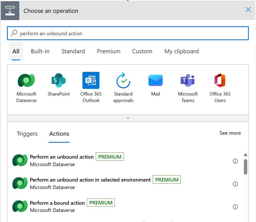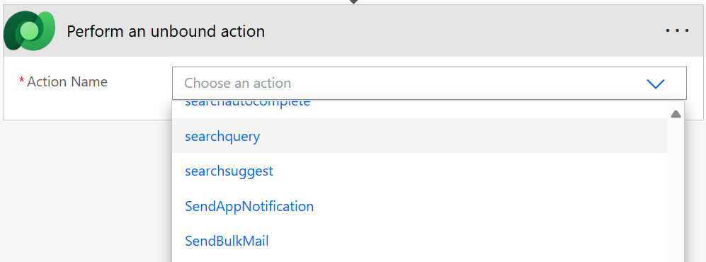 First job is to add an action to your cloud flow. Here search for and select Perform an unbound action
